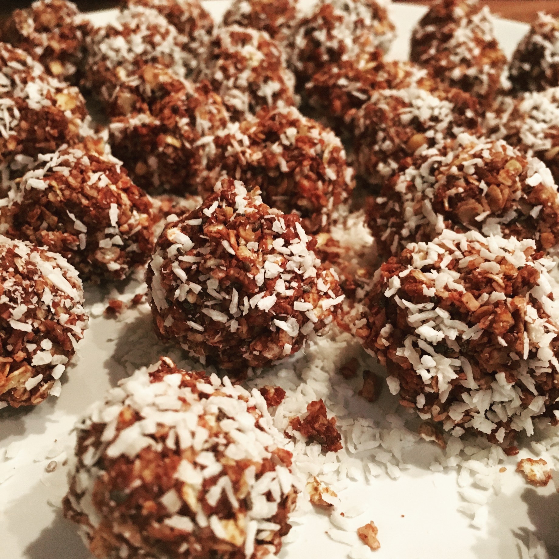 Cover with cling film and pop in the fridge for at least half an hour. Then take small amounts of the mixture and roll into a ball roughly the size of a ping pong ball. Once in a ball shape roll them in some more coconut and they’re ready!